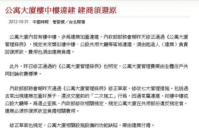中華民國八十四年六月二十八日總統華總(一)義字第4316號令公布全文五十二條 中華民國八十九年四月二十六日總統華總(一)義字第8900104430號令修正第二條條文 中華民國九十二年十二月三十一日總統華總[一]義字第09200243911號令修正中華民國九十五年一月十八日總統華總一義字第09500005871號令修正發布第二十九條條文;增訂第五十九條之一條文 中華民國一百零二年五月八日總統華總一義字第10200082711號令修正公布第八、二十七條條文第一章 總 則第一條 為加強公寓大廈之管理維護,提昇居住品質,特制定本條例。本條例未規定者,適用其他法令之規定。第二條 本條例所稱主管機關:在中央為內政部,在直轄市為直轄市政府;在縣(市)為縣(市)政府。第三條 本條例用辭定義如下:一、公寓大廈:指構造上或使用上或在建築執照設計圖樣標有明確界線,得區分為數 部分之建築物及其基地。二、區分所有:指數人區分一建築物而各有其專有部分,並就其共用部分按其應有部分有所有權。三、專有部分:指公寓大廈之一部分,具有使用上之獨立性,且為區分所有之標的者。四、共用部分:指公寓大廈專有部分以外之其他部分及不屬專有之附屬建築物,而供共同使用者。五、約定專用部分:公寓大廈共用部分經約定供特定區分所有權人使用者。六、約定共用部分:指公寓大廈專有部分經約定供共同使用者。七、區分所有權人會議:指區分所有權人為共同事務及涉及權利義務之有關事項,召集全體區分所有權人所舉行之會議。八、住戶:指公寓大廈之區分所有權人、承租人或其他經區分所有權人同意而為專有部分之使用者或業經取得停車空間建築物所有權者。九、管理委員會:指為執行區分所有權人會議決議事項及公寓大廈管理維護工作,由區分所有權人選任住戶若干人為管理委員所設立之組織。十、管理負責人:指未成立管理委員會,由區分所有權人推選住戶一人或依第二十八條第三項、第二十九條第六項規定為負責管理公寓大廈事務者。十一、管理服務人:指由區分所有權人會議決議或管理負責人或管理委員會僱傭或委任而執行建築物管理維護事務之公寓大廈管理服務人員或管理維護公司。十二、規約:公寓大廈區分所有權人為增進共同利益,確保良好生活環境,經區分所有權人會議決議之共同遵守事項。第二章 住戶之權利義務第四條 區分所有權人除法律另有限制外,對其專有部分,得自由使用、收益、處分,並排除他人干涉。專有部分不得與其所屬建築物共用部分之應有部分及其基地所有權或地上權 之應有部分分離而為移轉或設定負擔。第五條 區分所有權人對專有部分之利用,不得有妨害建築物之正常使用及違反區分所有權人共同利益之行為。第六條 住戶應遵守下列事項:一、於維護、修繕專有部分、約定專用部分或行使其權利時,不得妨害其他住戶之安寧、安全及衛生。二、他住戶因維護、修繕專有部分、約定專用部分或設置管線,必須進入或使用其專有部分或約定專用部分時,不得拒絕。三、管理負責人或管理委員會因維護、修繕共用部分或設置管線,必須進入或使用其專有部分或約定專用部分時,不得拒絕。四、於維護、修繕專有部分、約定專用部分或設置管線,必須使用共用部分時,應經管理負責人或管理委員會之同意後為之。五、其他法令或規約規定事項。前項第二款至第四款之進入或使用,應擇其損害最少之處所及方法為之,並應修復或補償所生損害。住戶違反第一項規定,經協調仍不履行時,住戶、管理負責人或管理委員會得按其性質請求各該主管機關或訴請法院為必要之處置。第七條 公寓大廈共用部分不得獨立使用供做專有部分。其為下列各款者,並不得為約定專用部分:一、公寓大廈本身所占之地面。二、連通數個專有部分之走廊或樓梯,及其通往室外之通路或門廳;社區內各巷道、防火巷弄。三、公寓大廈基礎、主要樑柱、承重牆壁、樓地板及屋頂之構造。四、約定專用有違法令使用限制之規定者。五、其他有固定使用方法,並屬區分所有權人生活利用上不可或缺之共用部分。第八條 公寓大廈周圍上下、外牆面、樓頂平臺及不屬專有部分之防空避難設備,其變更構造、顏色、設置廣告物、鐵鋁窗或其他類似之行為,除應依法令規定辦理外,該公寓大廈規約另有規定或區分所有權人會議已有決議,經向直轄市、縣(市)主管機關完成報備有案者,應受該規約或區分所有權人會議決議之限制。公寓大廈有十二歲以下兒童之住戶,外牆開口部或陽臺得設置不妨礙逃生且不突出外牆面之防墜設施。防墜設施設置後,設置理由消失且不符前項限制者,區分所有權人應予改善或回復原狀。住戶違反第一項規定,管理負責人或管理委員會應予制止,經制止而不遵從者,應報請主管機關依第四十九條第一項規定處理,該住戶並應於一個月內回復原狀。屆期未回復原狀者,得由管理負責人或管理委員會回復原狀,其費用由該住戶負擔。第九條 各區分所有權人按其共有之應有部分比例,對建築物之共用部分及其基地有使用收益之權。但另有約定者從其約定。住戶對共用部分之使用應依其設置目的及通常使用方法為之。但另有約定者從其約定。前二項但書所約定事項,不得違反本條例、區域計畫法、都市計畫法及建築法令之規定。住戶違反第二項規定,管理負